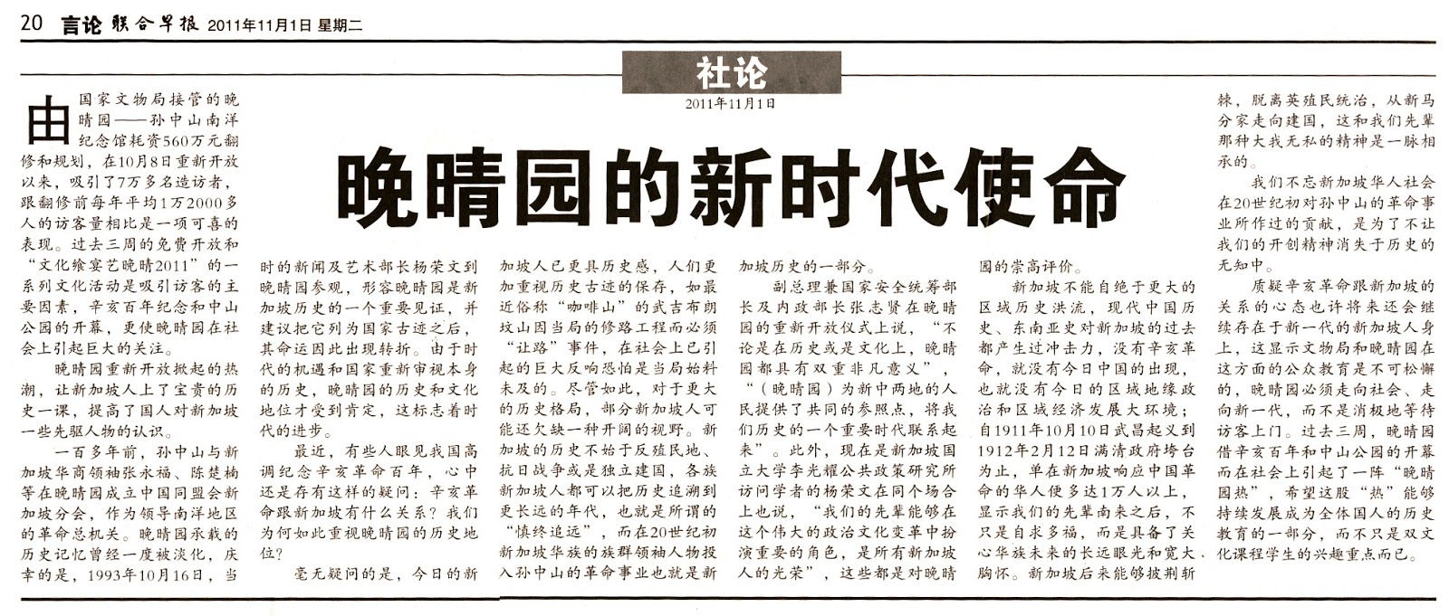 ·2011年9月30日《联合早报》- 配合辛亥革命百年纪念 晚晴园10月9日重新开放·2011年9月30日