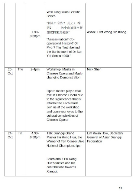 此外,文化节还邀请本地学者及媒体工作者主讲“百年辛亥忆晚清”系列讲座,包括柯木林主讲《从渐变到突变: 辛亥革命百年祭》;黃贤强主讲《刺杀?合作? 历史? 神话?——孙中山被逐出新加坡的来龙去脉》;杜南发主讲《空白的足迹——孙中山来新次数及同盟会成立时间探讨》。其他讲座如《围棋的历史与演变》、《新加坡的象棋发展》、《海派画对新加坡的影响》及“猜灯谜”讲座等。