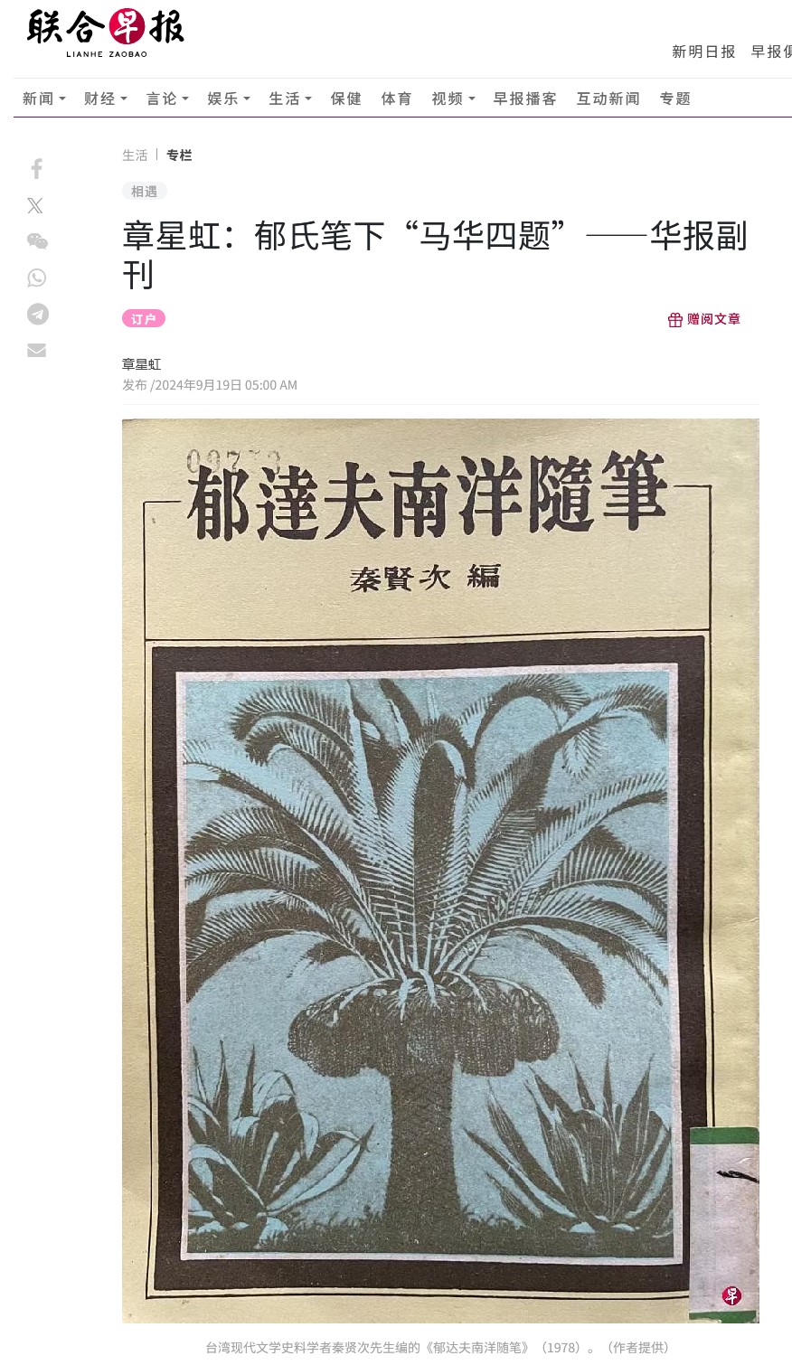 《联合早报》- 章星虹:郁氏笔下“马华四题”——华报副刊 (2024-09-19)