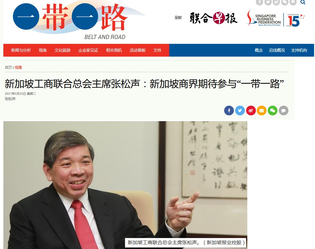 《联合早报》- 新加坡工商联合总会主席张松声:新加坡商界期待参与“一带一路” (2017-05-23)