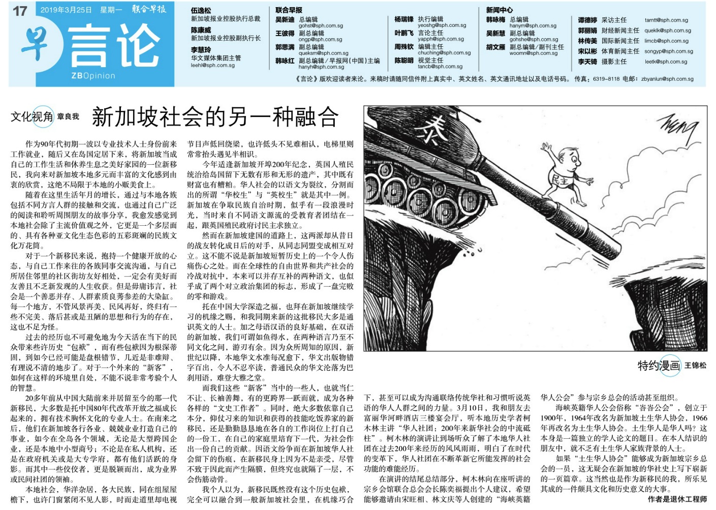《联合早报》- 章良我:新加坡社会的另一种融合 (2019-03-25)